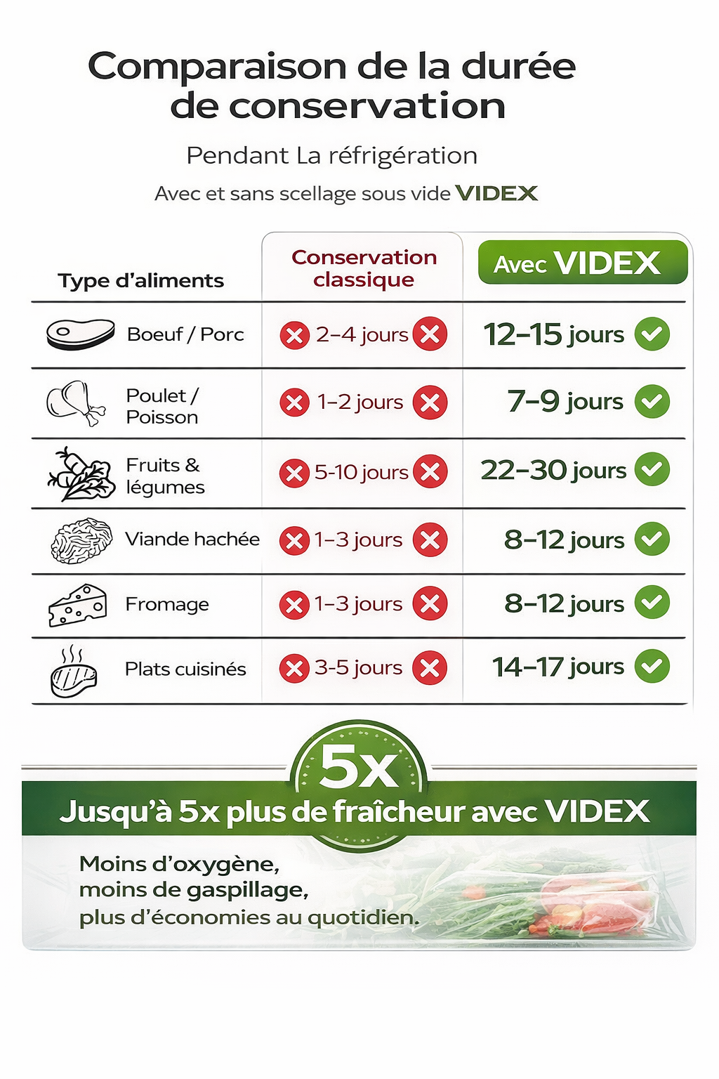 - Conservation durable et anti-gaspillage : Prolonge la fraîcheur des aliments jusqu’à 5 fois plus longtemps, tout en préservant saveur, texture et nutriments.